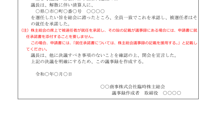 この株主総会で代表取締役を退任して代表清算人となったので、議事録作成者は代表清算人と書きます。